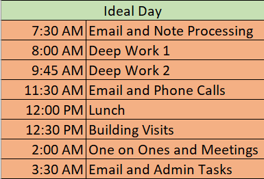 The Ideal Day recognizes that we have different energy levels and different focus levels at different points in the day. This differs for everyone, but generally, we all are inconsistent over the course of each day. If you have higher energy in the morning, that time is wasted if it is used on lower energy tasks such as purchase approvals. To maximize our impact each day, we need to consider our own day and try to control things as best we can. Truly, there are things that come up outside of your control that will not fit into your Ideal Day, and that is okay. This is about improvement, not perfection. Don’t be so rigid about this that it causes a hit to your relationships with others or affects your effectiveness in important areas of responsibility.